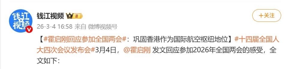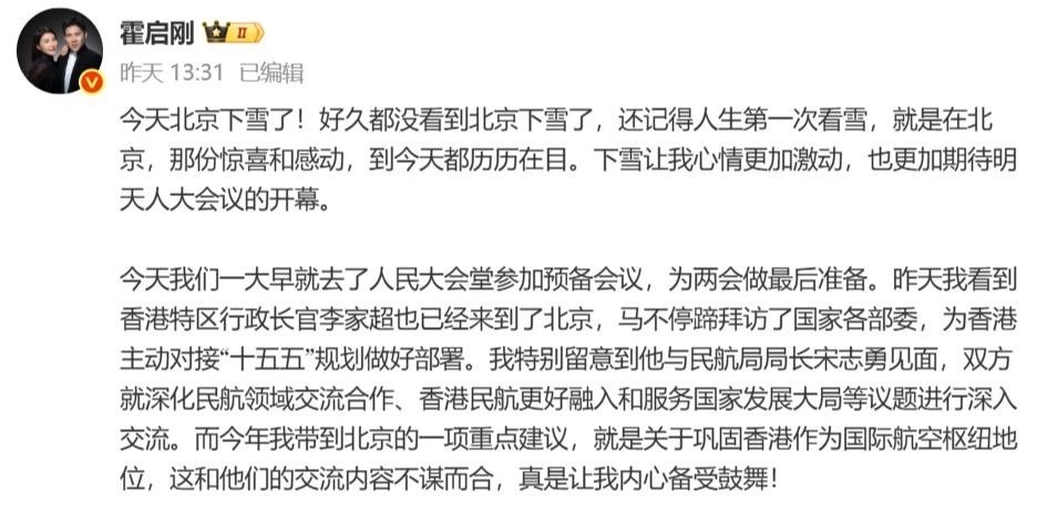 3月4日,霍启刚通过个人社交平台发布千字长文,真挚记录自己首次以港区全国人大代表身份出席全国两会的心路历程。